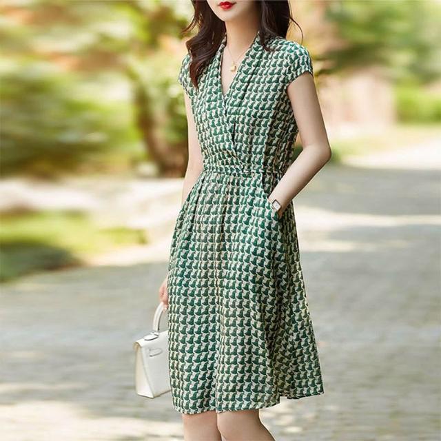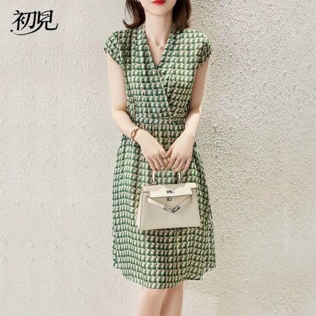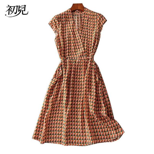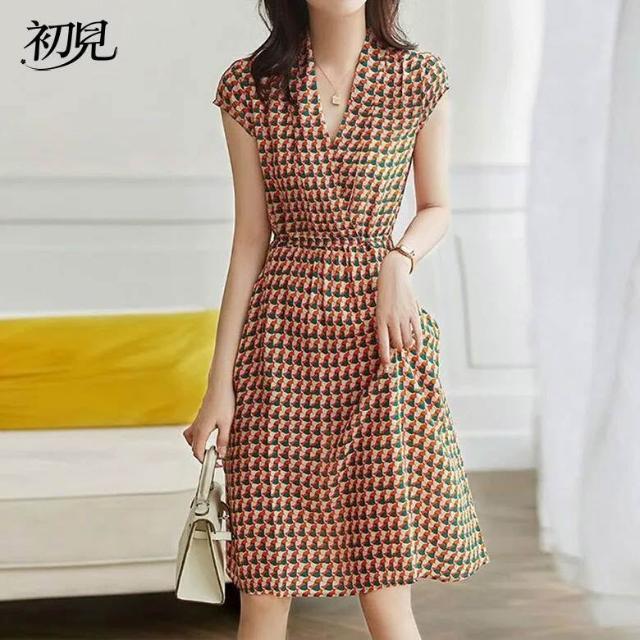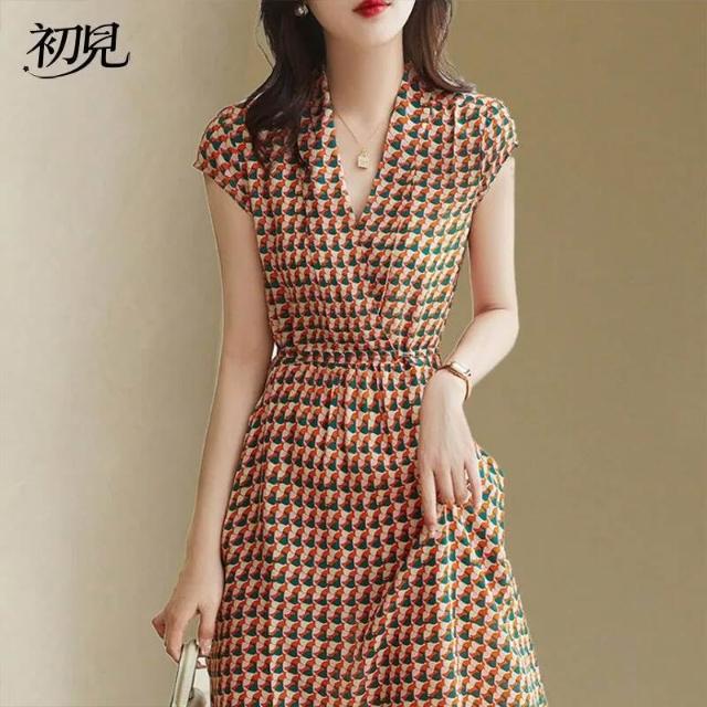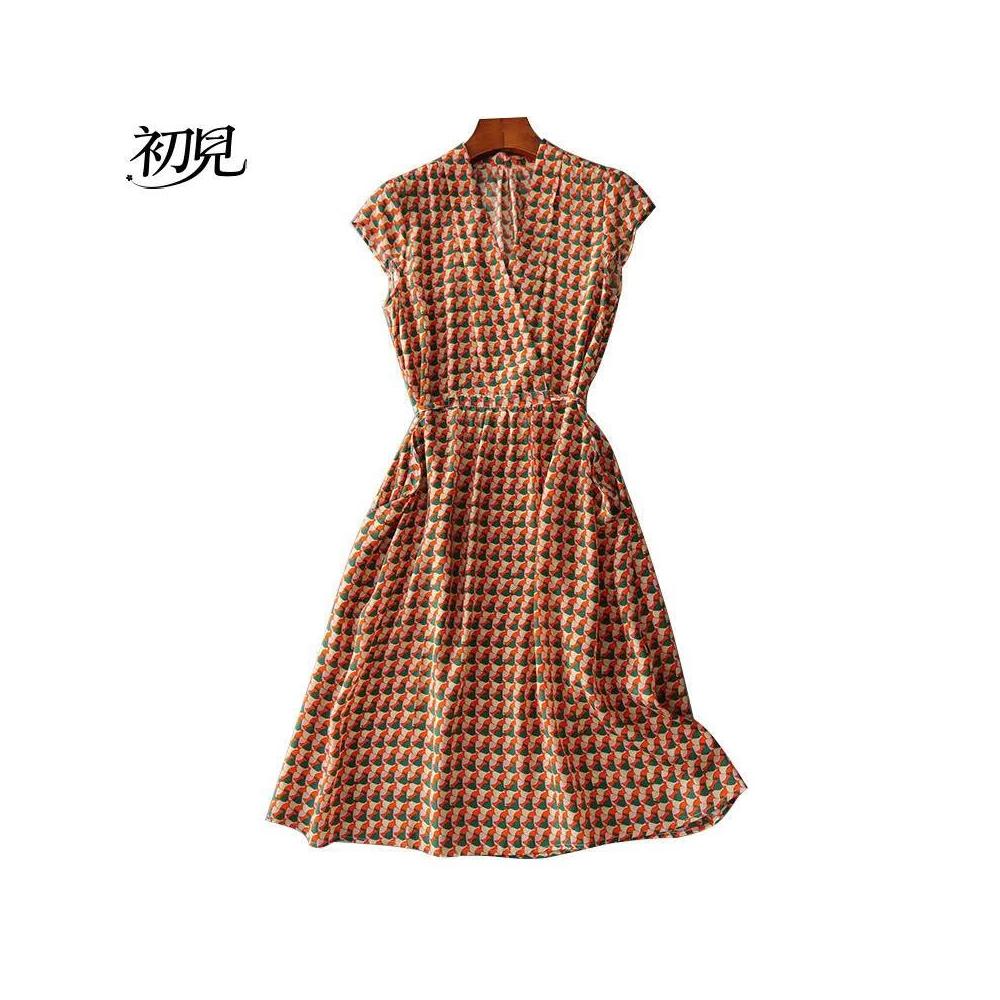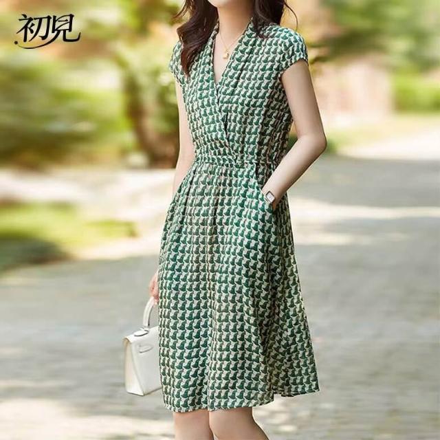 初見女裝 下著 半身裙長裙 吊帶裙 連衣裙 高端法式減齡桑蠶絲裙子 真絲連衣裙夏季新款氣質V領收腰顯瘦