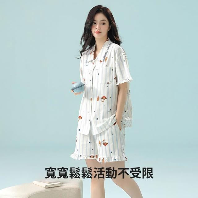 初見家居服 冰絲睡衣 純棉 寬鬆舒適 [抗菌新疆棉]a類拉架棉春夏季睡衣女純棉短袖卡通狗家居服套裝