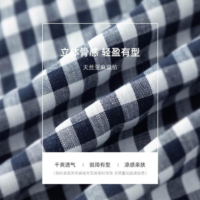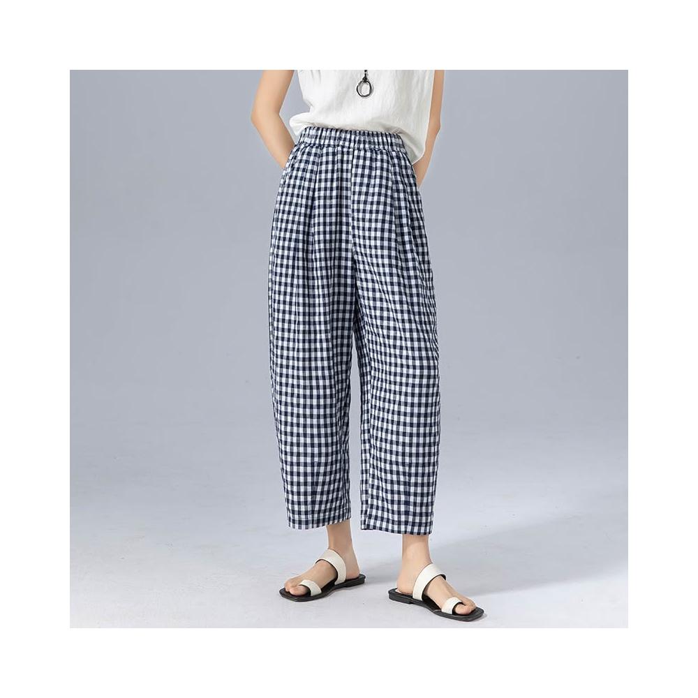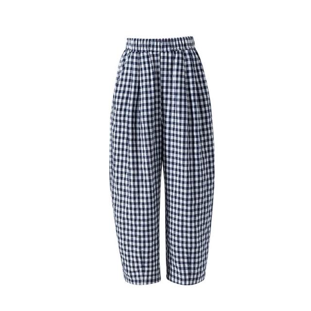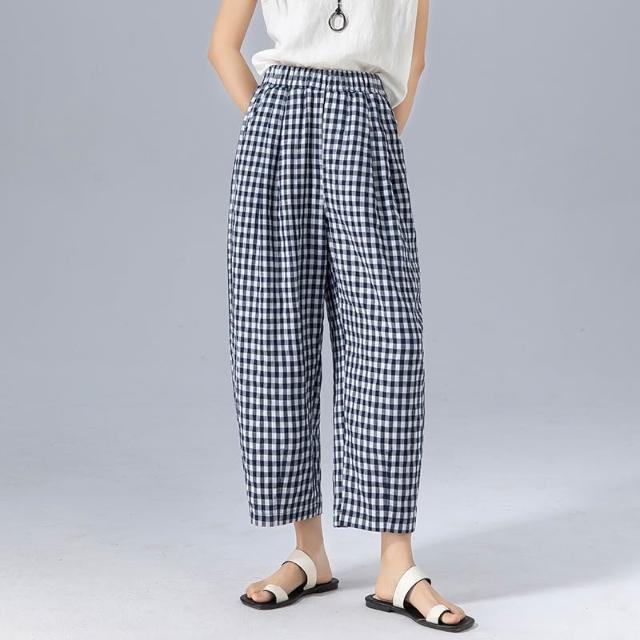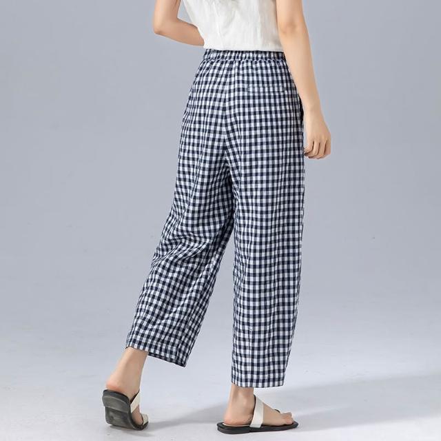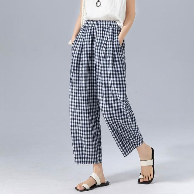 初見寬松九分褲 西裝褲 寬松休閑褲 闊腿褲 亞麻萊賽爾韓版慵懶風高腰格子九分褲女夏季薄款寬松遮肉顯瘦