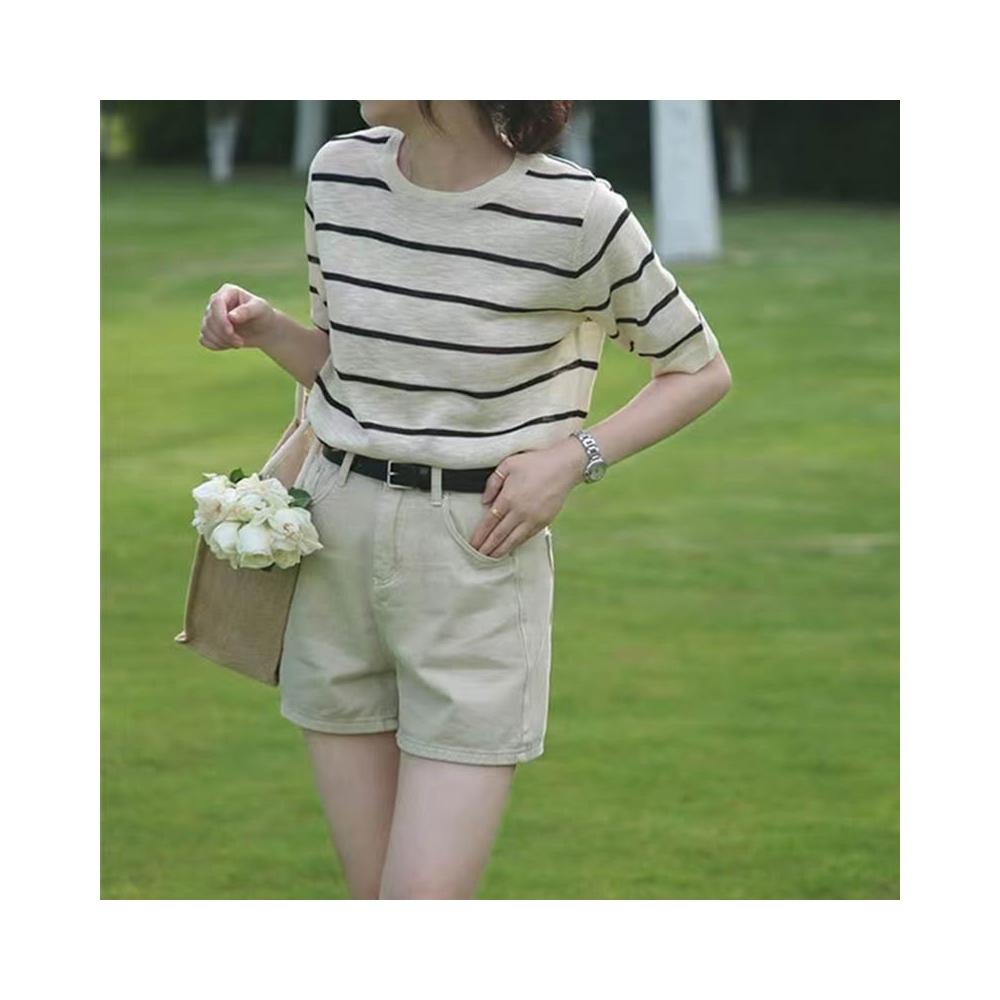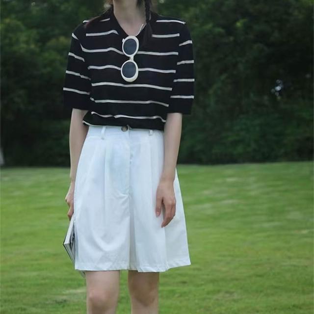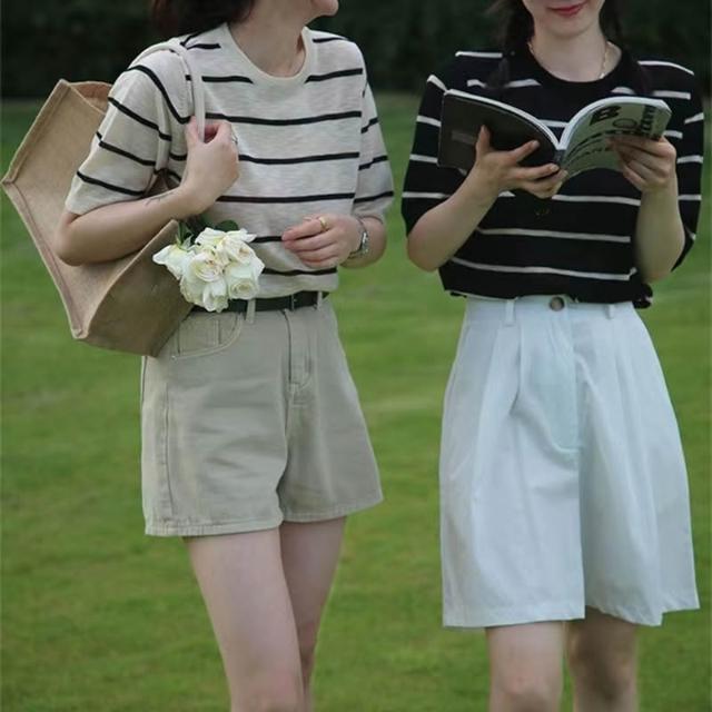 初見镂空短袖 休閑上衣 顯瘦針織衫 修身天絲上衣 韓系撞色條紋針織T恤女夏季新款圓領寬松薄款短袖上衣