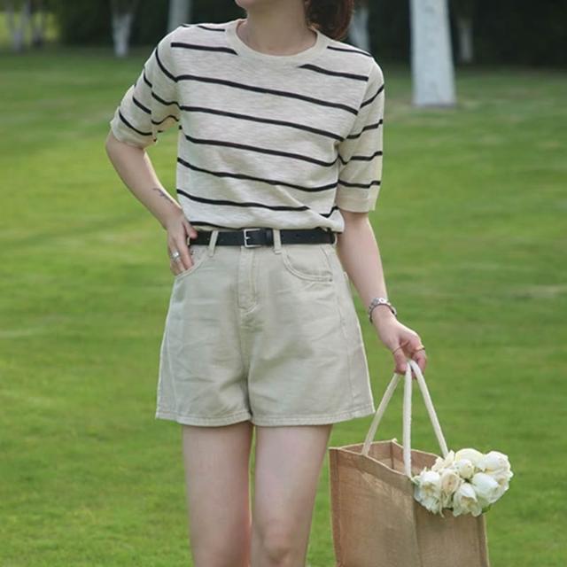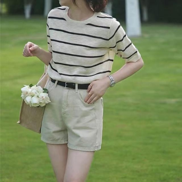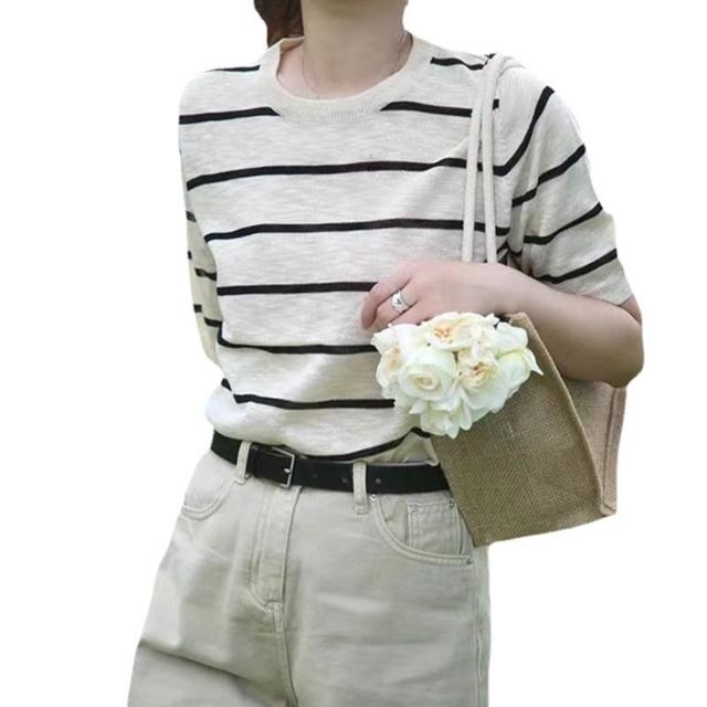 初見镂空短袖 休閑上衣 顯瘦針織衫 修身天絲上衣 韓系撞色條紋針織T恤女夏季新款圓領寬松薄款短袖上衣