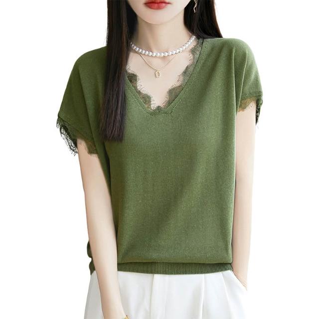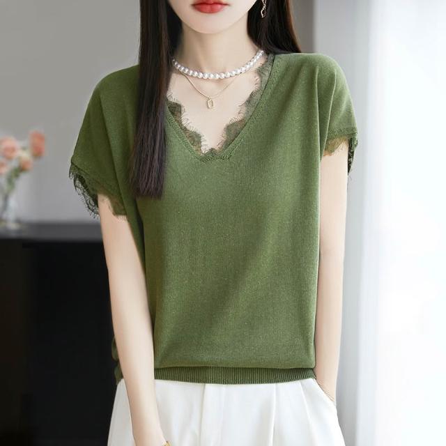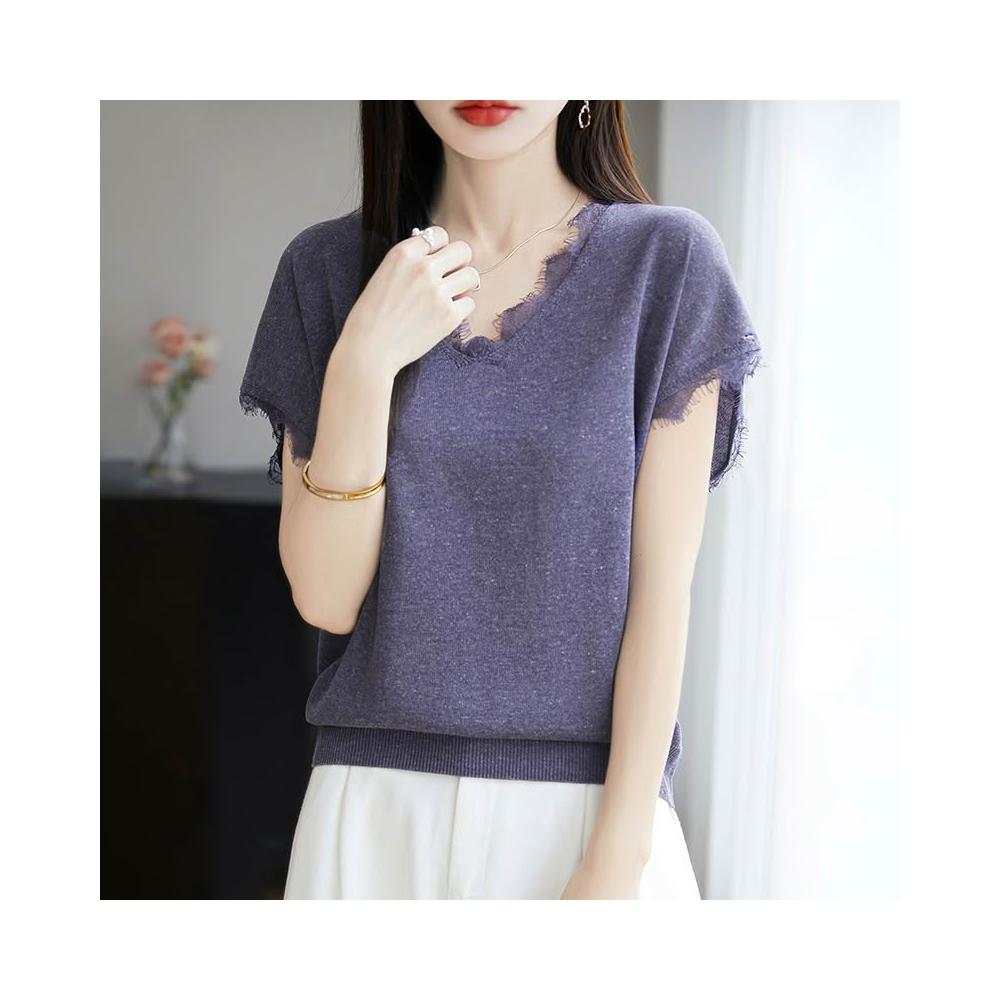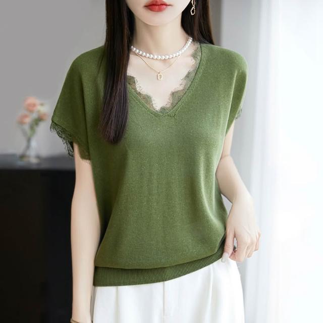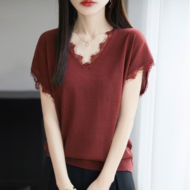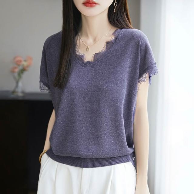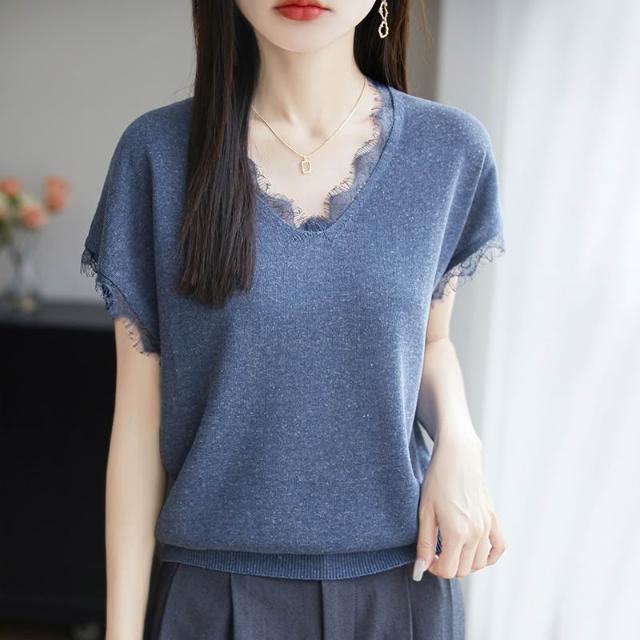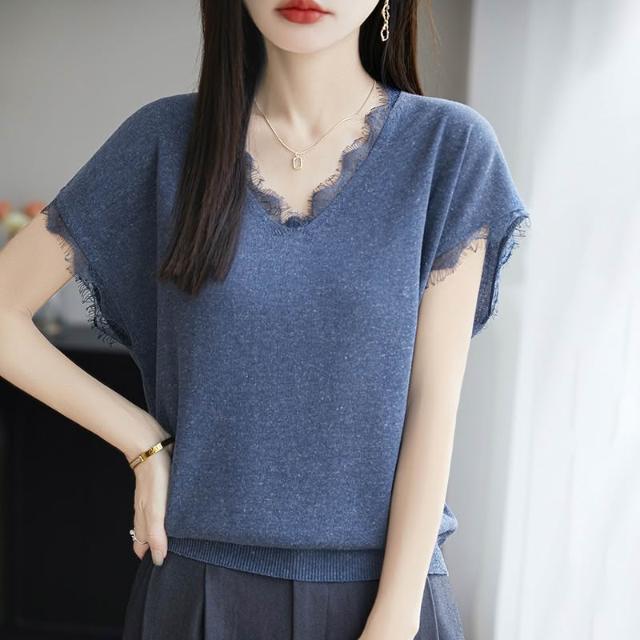 初見镂空短袖 休閑上衣 顯瘦針織衫 修身天絲上衣 夏季新款法式天絲亞麻V領針織衫短袖蕾絲花邊套頭女裝打底衫
