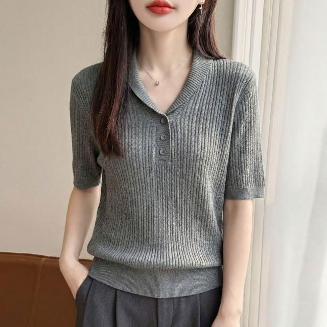 初見镂空短袖 休閑上衣 顯瘦針織衫 修身天絲上衣 設計感夏季新款針織短袖女翻領麻花T恤半袖氣質百搭打底藍色小衫