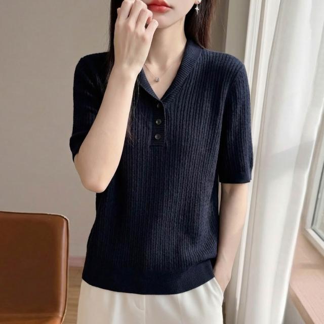 初見镂空短袖 休閑上衣 顯瘦針織衫 修身天絲上衣 設計感夏季新款針織短袖女翻領麻花T恤半袖氣質百搭打底藍色小衫