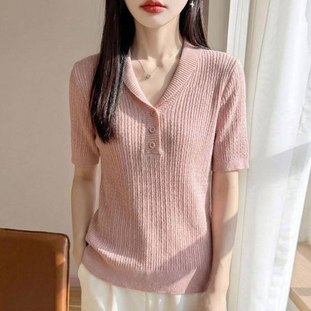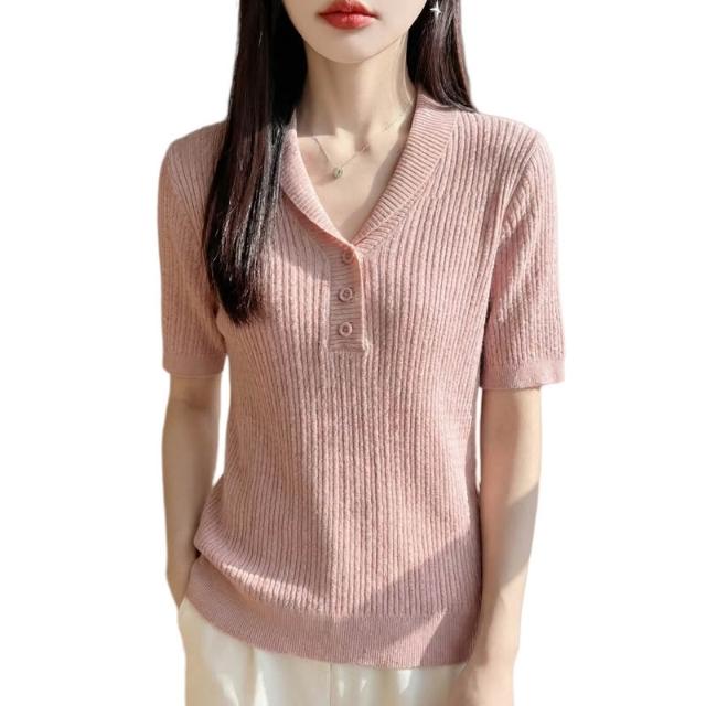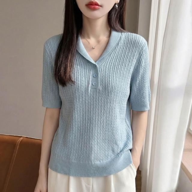 初見镂空短袖 休閑上衣 顯瘦針織衫 修身天絲上衣 設計感夏季新款針織短袖女翻領麻花T恤半袖氣質百搭打底藍色小衫