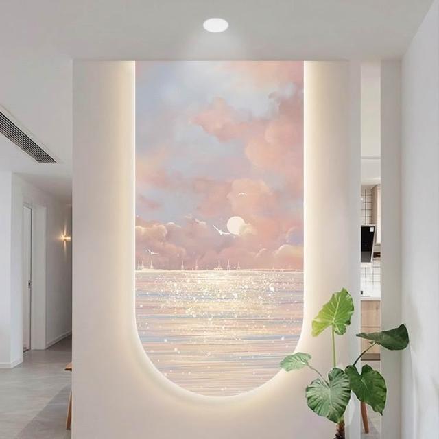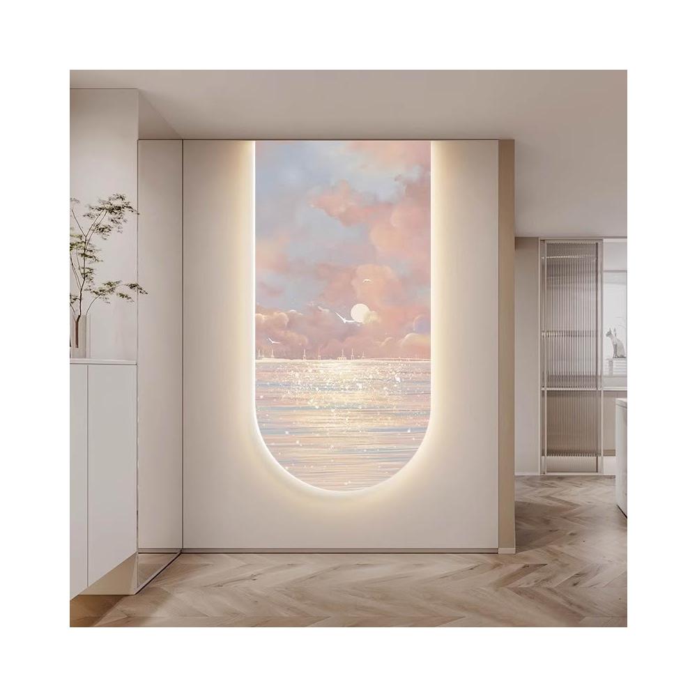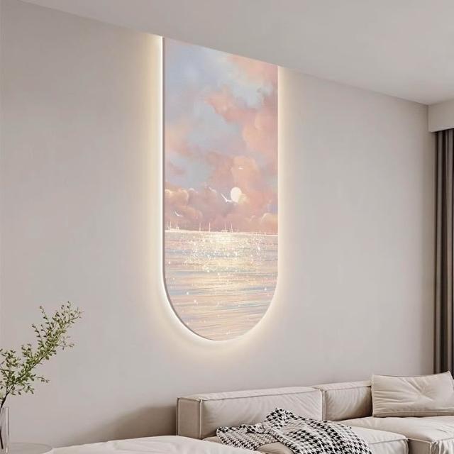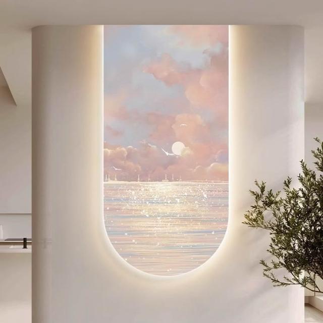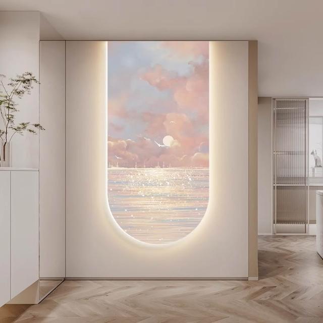 初見背景墻掛畫 玄關掛畫 手繪油畫 法式奶油風入戶玄關裝飾畫高級感led燈光畫過道走廊客廳掛畫