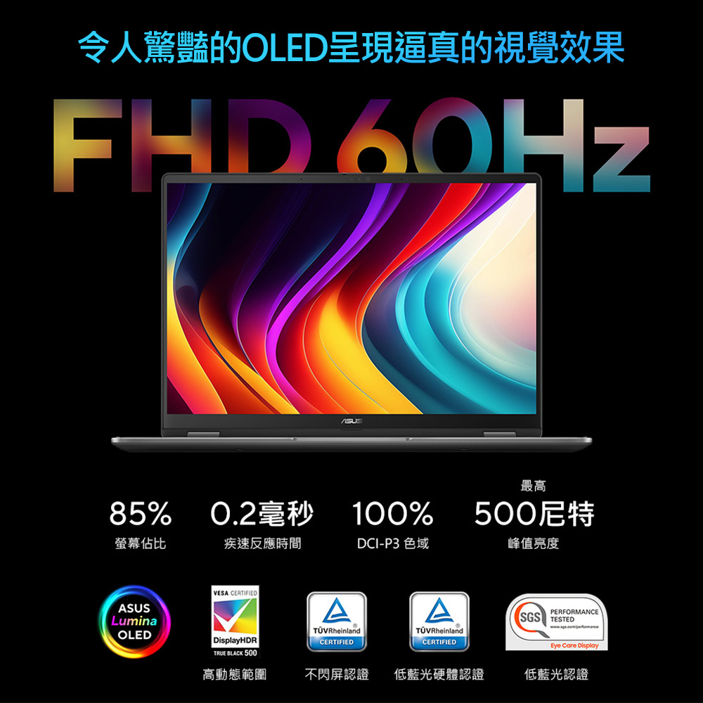 👓如前文所述,擁有OLED面板,85%的螢幕占比、FHD 60Hz且高對比色彩鮮豔,同時具備不閃屏、低藍光硬體認證。讓您融入不同影視作品及頁面的同時能夠保護您的靈魂視窗。