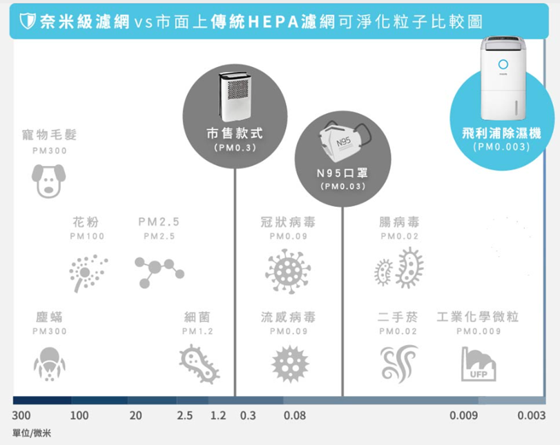 這台是清淨除濕二合一,清淨力也不妥協,維持飛利浦清淨機的優點,能濾到奈米級(PM0.003),等於大部分常見的病毒都不用害怕了!