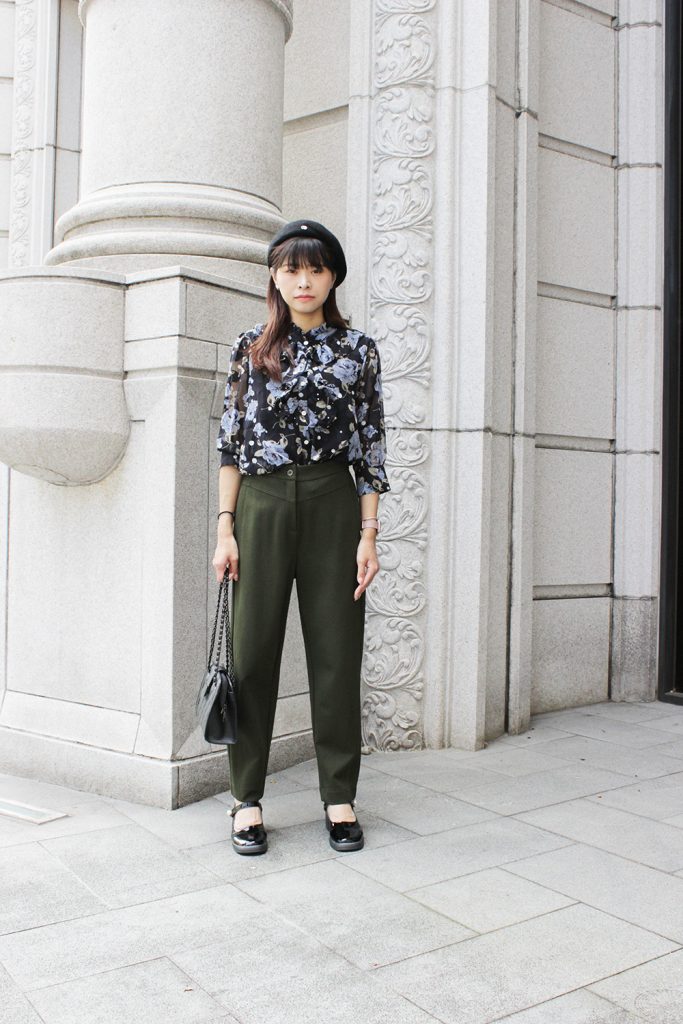 穿搭要點:哥德式風襯衫+墨綠色彎刀褲+貝雷帽+菱格包
