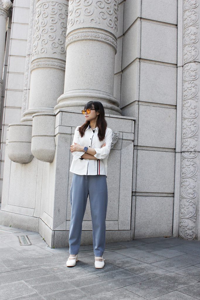 想在日常中帶點時尚感小心機,休閒襯衫搭配淺藍色彎刀褲,輕鬆自在又有型,撞色墨鏡看起來更活潑,加上配件Apple Watch的科技感,整體看起來隨性又不失時髦。