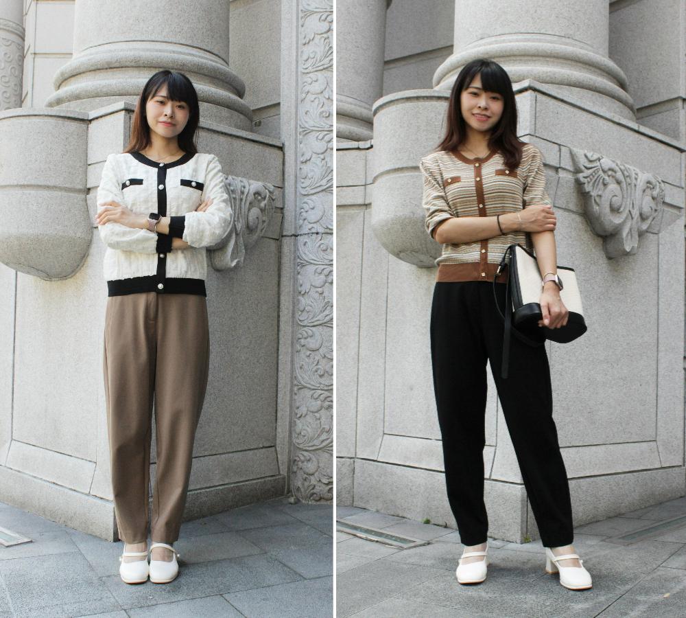 穿搭要點:小香風上衣或外套+駝色、黑色彎刀褲+白色包頭鞋+水桶包