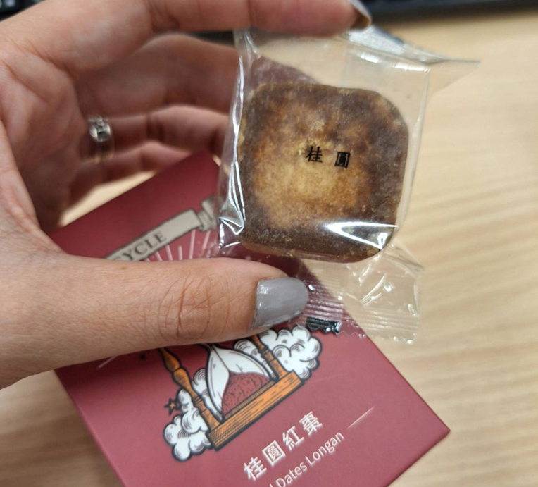 加熱水沖泡時,立即可以聞到滿滿的桂圓香氣,也能吃得到些微桂圓、紅棗。香甜的桂圓和紅棗結合黑糖的自然甘甜,口感溫潤,甜而不膩。桂圓紅棗是補氣的,能增加氣色紅潤。