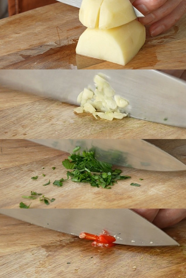 加點鹽巴調味之後放進蒜頭跟馬鈴薯,淋上今天的主角『茉麗華 特級冷壓初榨橄欖油』
