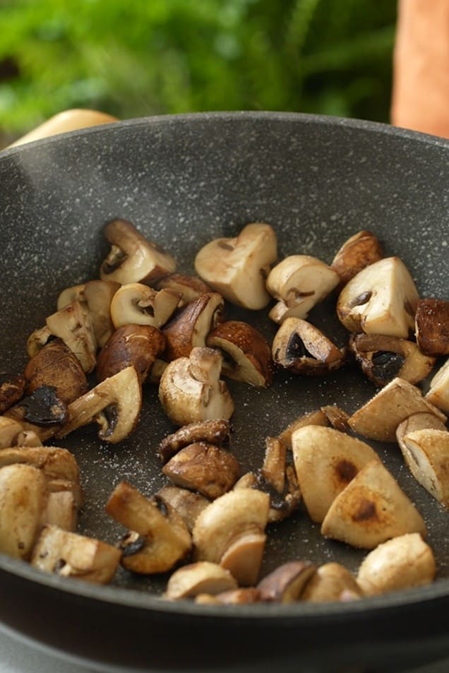 3.然後鍋子裡先不放油,把蘑菇丟進去用中火乾煎到香香又焦焦的