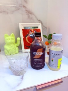 先來用無糖口味,倒入超商買的蜂蜜檸檬,當然一定要加很多冰塊,馬上做出一杯蜂蜜西西里冰咖啡,老實講這樣做特調真的簡單又很好玩!