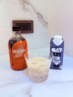 再來我玩了焦糖口味,焦糖口味很香甜,香氣持久,就算加入牛奶中也不會淡掉,很符合廣告說的:加冰塊也不會淡掉!用焦糖做了一杯燕麥奶焦糖拿鐵,也是去超商買了燕麥奶,加入濃縮咖啡液和冰塊就可以秒完成。燕麥奶的圓潤包覆了焦糖的香甜,濃郁又香氣層次豐富,很適合夏日午後來一杯,非常爽快!
