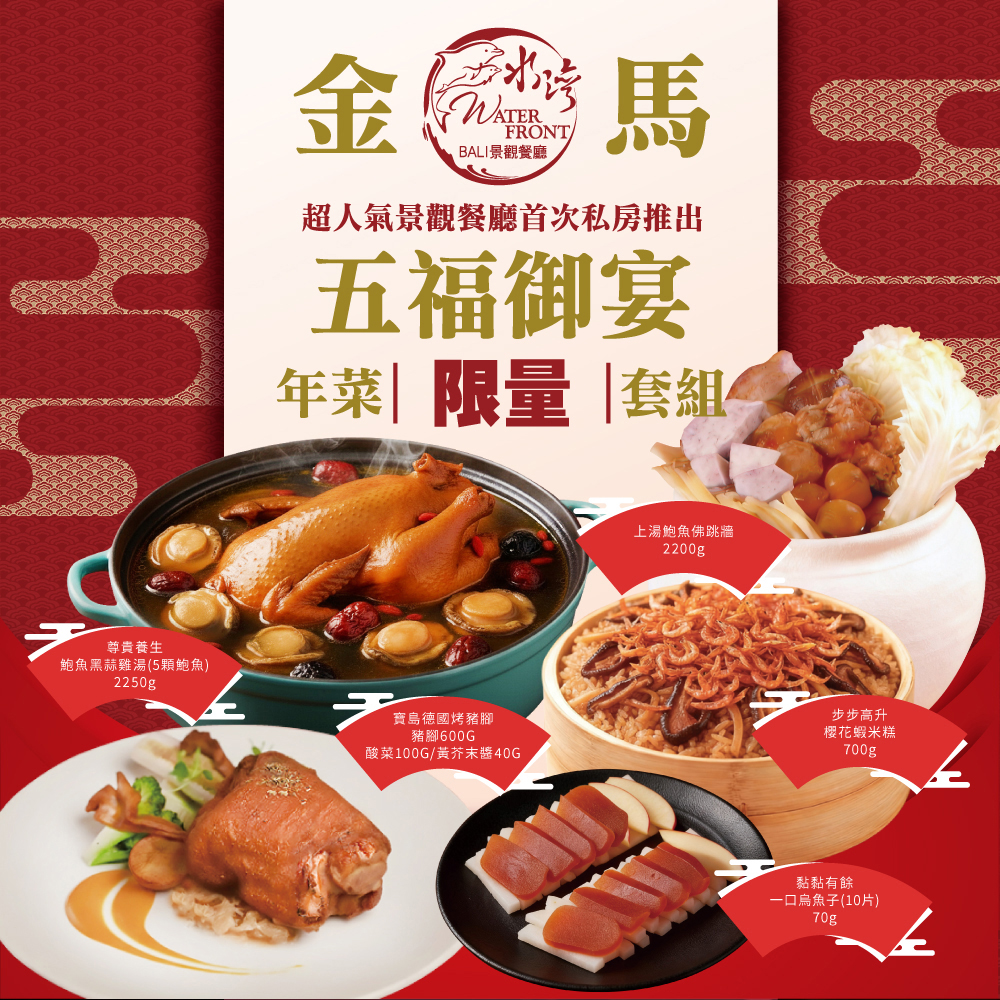選了我最愛的餐廳,在淡水、碧潭非常有名”「水灣景觀餐廳(Water Front)」”首次推出的年菜套組——金馬五福御宴。