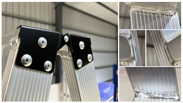 更厲害的是,這個工作梯最高承重高達200公斤,祕訣就在於鋁管相接處採四面滿焊工法製作,而非一般市面的鉚釘接合工法;而且梯子頂部兩側都裝有鋼片加固,所以踩起來十分穩固,完全不會晃喔!🙌🙌🙌