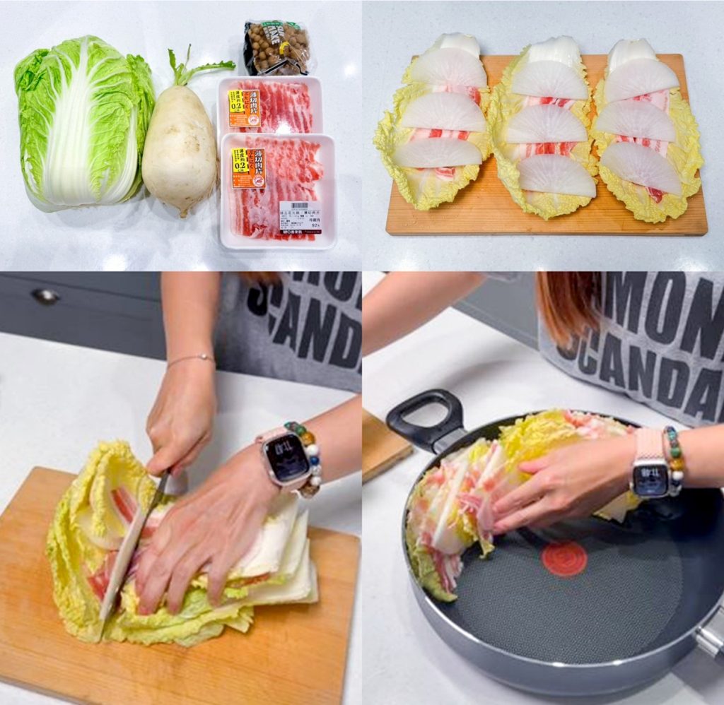 3..將一層層的白菜、豬肉與白蘿蔔鋪好,並切成三等份