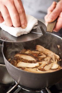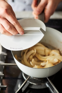 最讓我驚喜的是,雖然是鑄鐵材質,但拿起來竟然這麼輕!單柄的設計加上輕量化處理,我單手拿著翻炒或倒湯完全不會累,很難想像這竟然是鑄鐵鍋。而且最特別的是這款雪平鍋有專屬自己的「落蓋」,落蓋的料理方式真的非常少見,落蓋也是鑄鐵材質,拿來燉煮時可以重壓食材,除了讓食物不容易在鍋裡亂滾碎裂,還能讓醬汁更入味,也會讓導熱變得更好,真的是很聰明的料理小工具。