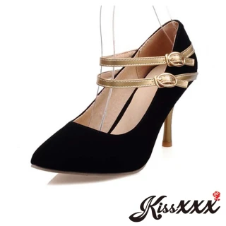 【KissXXX】美腿效果小尖頭金色繫帶絨面高跟鞋(黑)