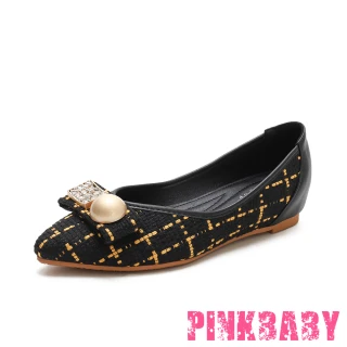 【PINKBABY】低跟娃娃鞋 尖頭娃娃鞋/尖頭軟底時尚美鑽珍珠釦飾格紋內增高低跟單鞋(黑)