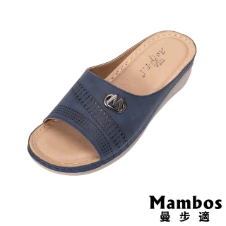 【Mambos 曼步適】厚底拖鞋 坡跟拖鞋/簡約車線縷空舒適厚底坡跟拖鞋(藍)