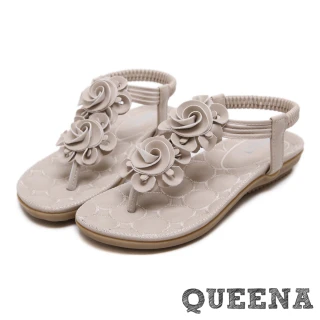 【QUEENA】甜美立體玫瑰造型T字舒適平底涼鞋(米)