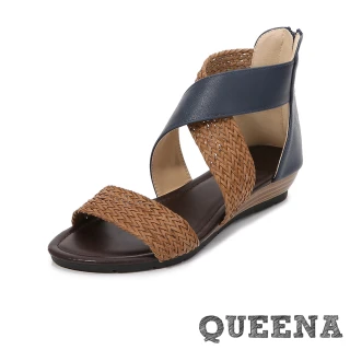 【QUEENA】坡跟涼鞋 一字涼鞋/百搭復古編織拼接一字交叉坡跟厚底涼鞋(藍)