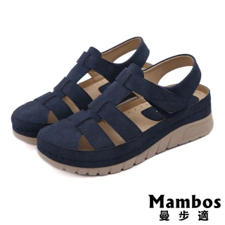 【Mambos 曼步適】厚底涼鞋 縷空涼鞋 編織涼鞋/復古縷空包頭編織個性厚底羅馬涼鞋(藍)