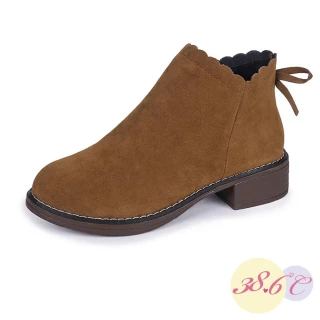 【38.6°C】花型靴口蝴蝶結飾純色絨面粗跟短靴(卡其)