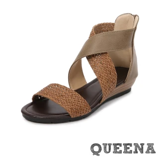 【QUEENA】坡跟涼鞋 一字涼鞋/百搭復古編織拼接一字交叉坡跟厚底涼鞋(卡其)
