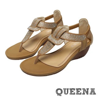 【QUEENA】美鑽繩結燙鑽T字時尚舒適坡跟夾腳涼鞋(棕)