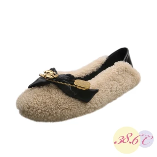 【38.6°C】平底便鞋 便鞋/可愛捲捲毛絨蝴蝶結小熊別針造型便鞋(米)