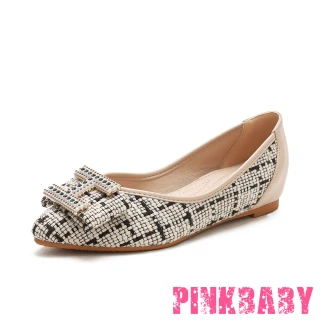 【PINKBABY】低跟娃娃鞋 尖頭娃娃鞋/尖頭軟底金屬釦蝴蝶結造型格紋內增高低跟單鞋(杏)