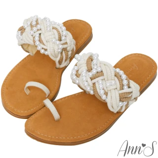 【Ann’S】水洗牛皮-珍珠麻花粗針織套指圓頭平底涼拖鞋(米白)