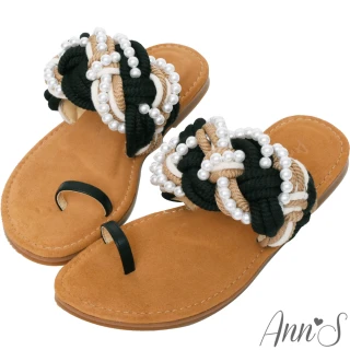 【Ann’S】水洗牛皮-珍珠麻花粗針織套指圓頭平底涼拖鞋(黑)