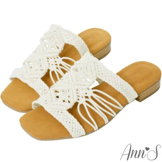 【Ann’S】水洗牛皮-BOHO風純手工編織木紋跟方頭涼拖鞋(米白)