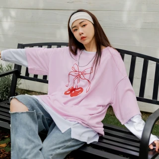 【OB 嚴選】寬版蝴蝶結櫻桃印花落肩短T 《AB19885》