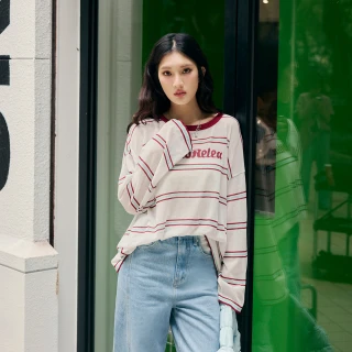 【OB 嚴選】雲朵自訂款條紋針織木耳邊船領上衣 《AB19832》