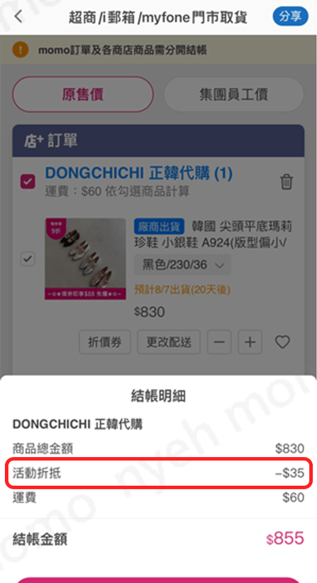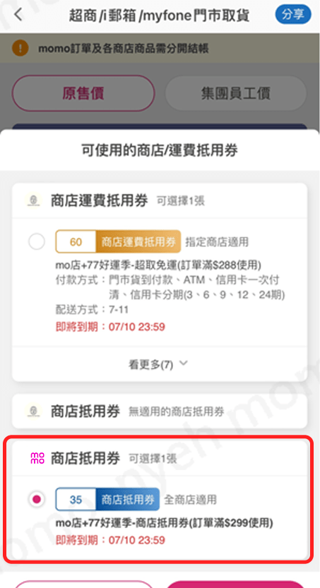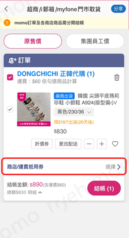 3.在mo店+的商品購物車選擇[商店/運費抵用券]
