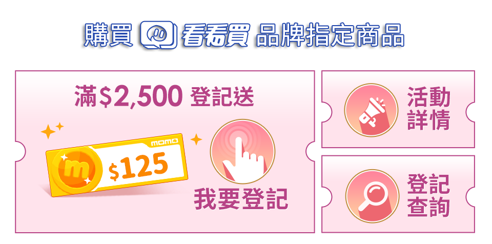 - 活動期間於購物網或購物網APP購買看看買【秋衣時尚節】指定商品,滿$2,500登記送「125mo幣」,實際回饋金額將由系統自動計算,活動期間每人僅限登記一次,共限額400名。