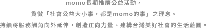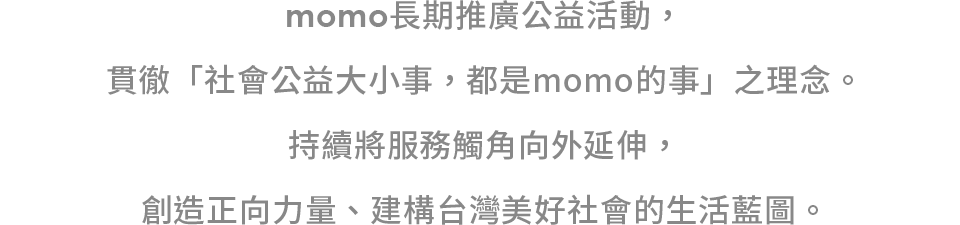 momo長期關注社會議題並致力打造「網路公益平台」,期盼與您一同傳遞良善的能量,讓愛延續。