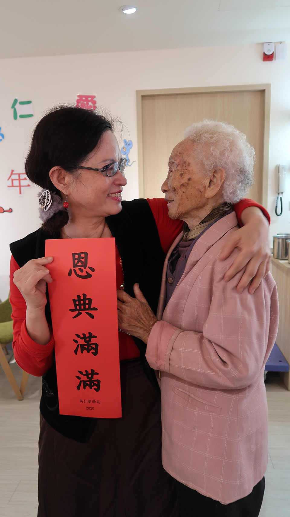 後來,阿足姨的家人找到切膚之愛基金會的失智症日照中心,一開始她會抗拒,但時間久了,在學苑有了可以聊天談心的對象,即使今天突然不想來上課,日照中心也會派照服員到家中陪伴吃飯和吃藥,這裡成為她心中第二個家,不識字的阿足姨在這裡學會了寫字,主動在春聯上寫下了「恩典滿滿」四個字,並表達她對大家的感謝。