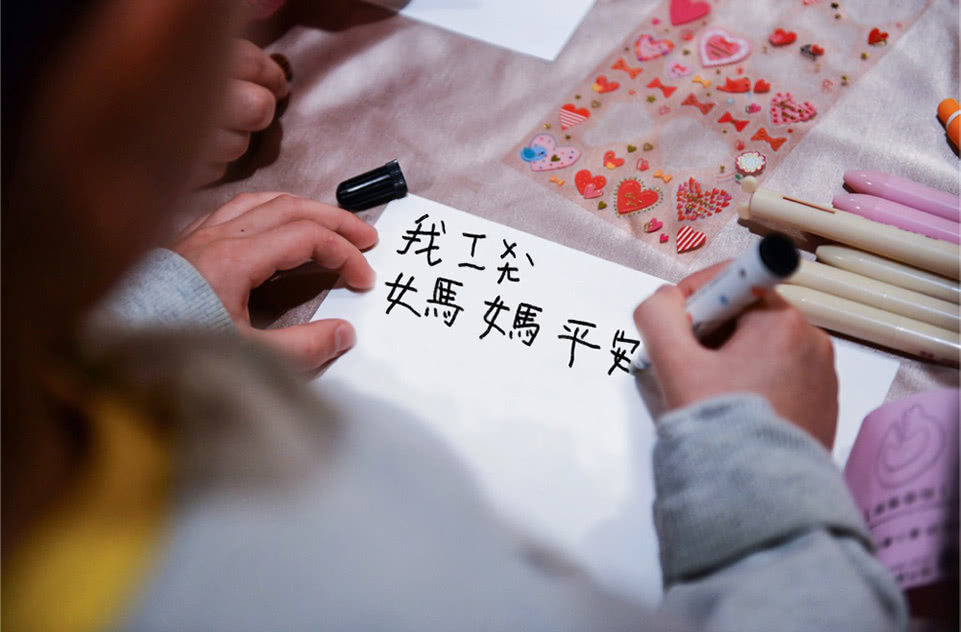 剛學會寫字的小琴,小手在卡片上寫下了歪斜的字:「我ㄒㄧ ㄨㄤˋ媽媽平安。」