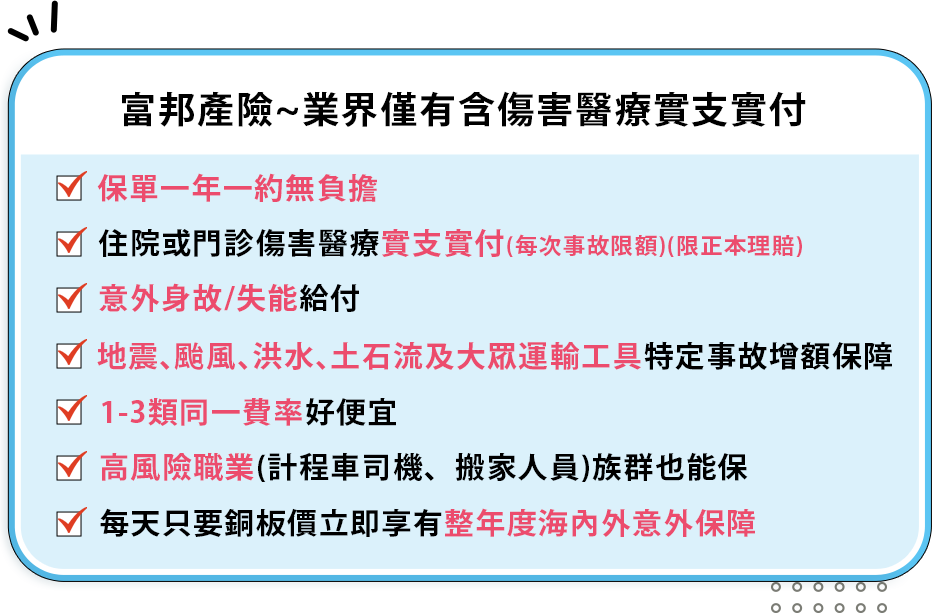 自112年12月1日起,富邦產險僅受理被保險人第一張 (產、壽險業合計 )實支實付型傷害醫療保險保單之申請。