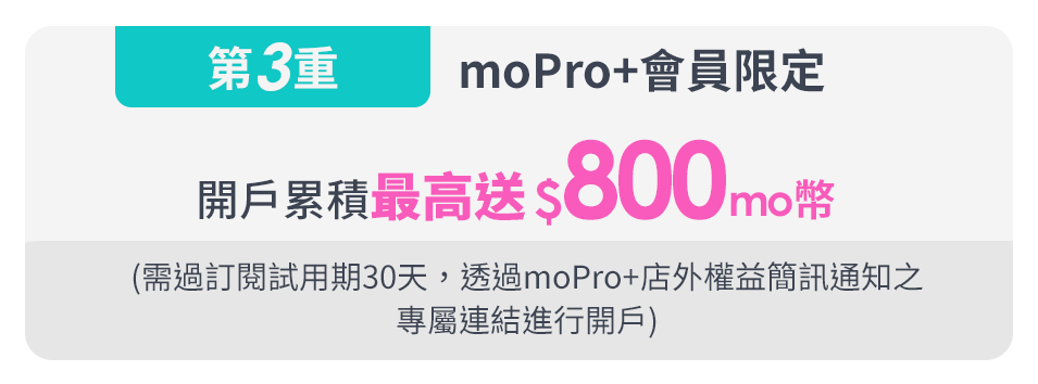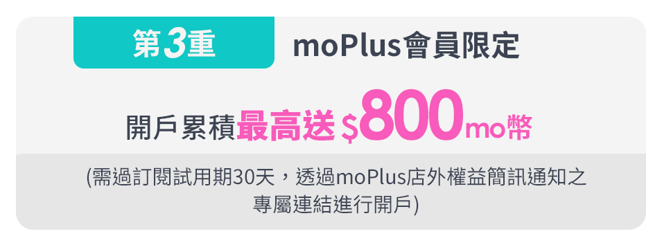 - moPlus會員需透過店外權益簡訊領取通知之專屬開戶連結進行開戶
