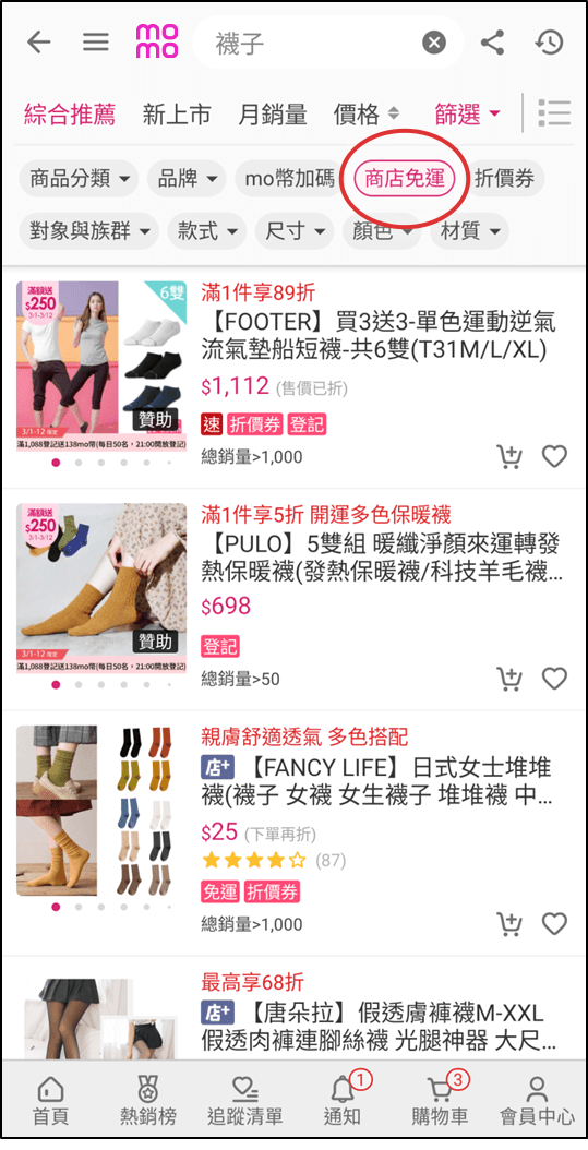 2.使用搜尋的篩選功能選擇[商店免運]更容易找到