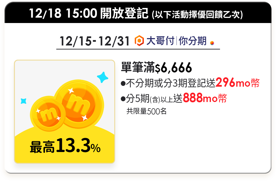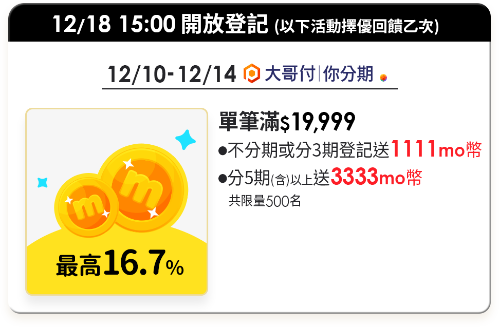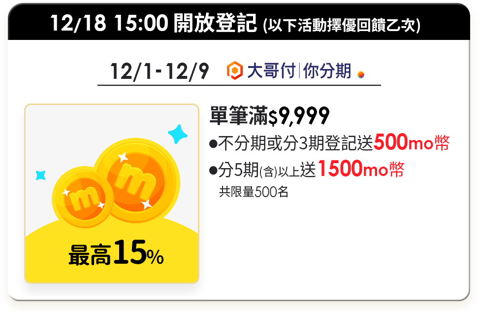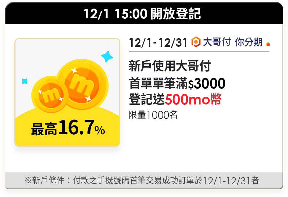 - 本服務目前僅開放台灣大哥大(下簡稱台灣大)個人月租型用戶使用,實際可分期數、分期金額依momo購物結帳頁面所示。由於目前本服務尚未開放於momo電腦版網頁(web)使用,故,敬請於結帳時使用momo購物網手機應用程式(APP),或momo行動版網頁(手機開啟:https://www.momoshop.com.tw),方可見【大哥付你分期】支付方式(下簡稱此付款方式)。唯實際可使用與否,將依照您於連結頁面輸入的手機門號,判斷是否為台灣大個人月租型用戶,以此做條件檢核。