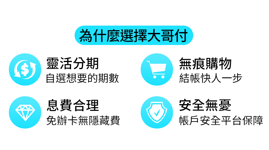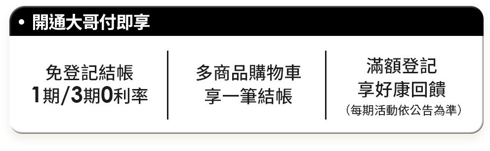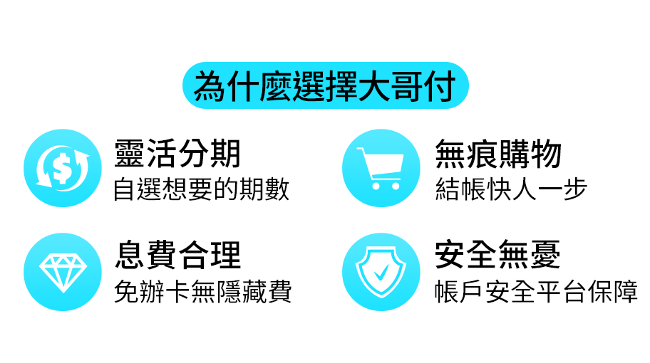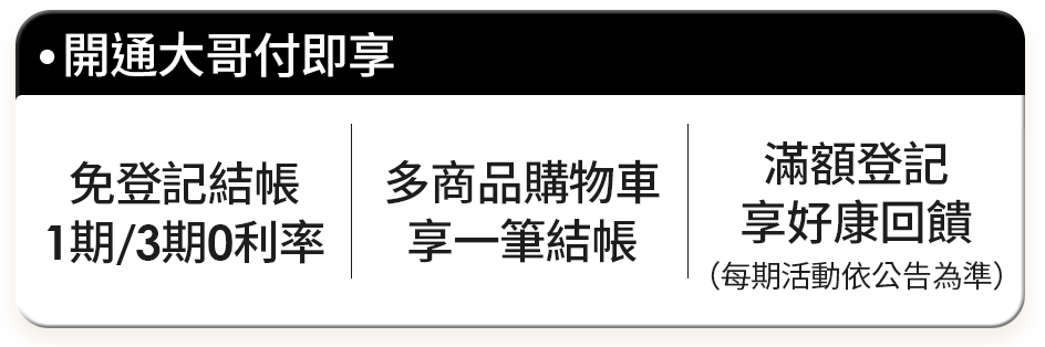 - 大哥付:讓您先買後付,無須持有信用卡也能享有「延後付款」或「分期付款」的自主彈性。